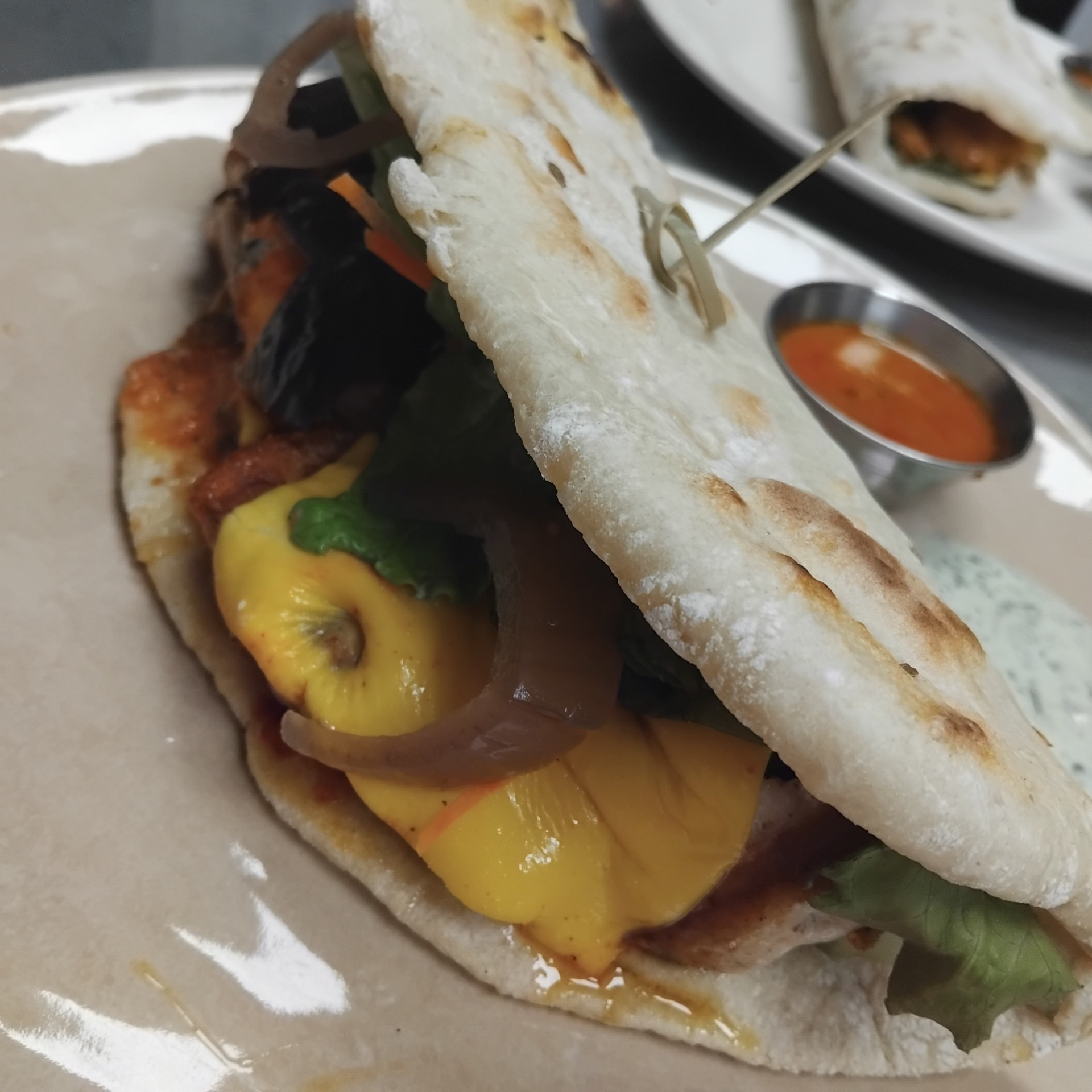 Cheese naan stylé burger, steak de poulet tandoori aux haricots noires en sauce indienne, crudités, aubergine rôtie, guacamole de mangues, pickles d'oignons à la rose, chutney vert, herbes fraiches, moutarde de la Cheffe, fromage fondu servit avec un chutney indien.